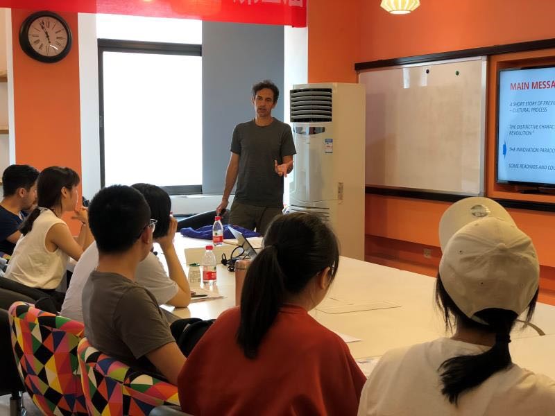 今天是夏令营的第三天,早上理论课程的The Theory of innovation and its application 是来自牛津大学教授 Stephen Boyle为我们授课,课程中以第一次和第二次工业革命对科技创新为案例进行讨论,开拓了大学生的创业思维,引起了同学们之间激烈的学术讨论。